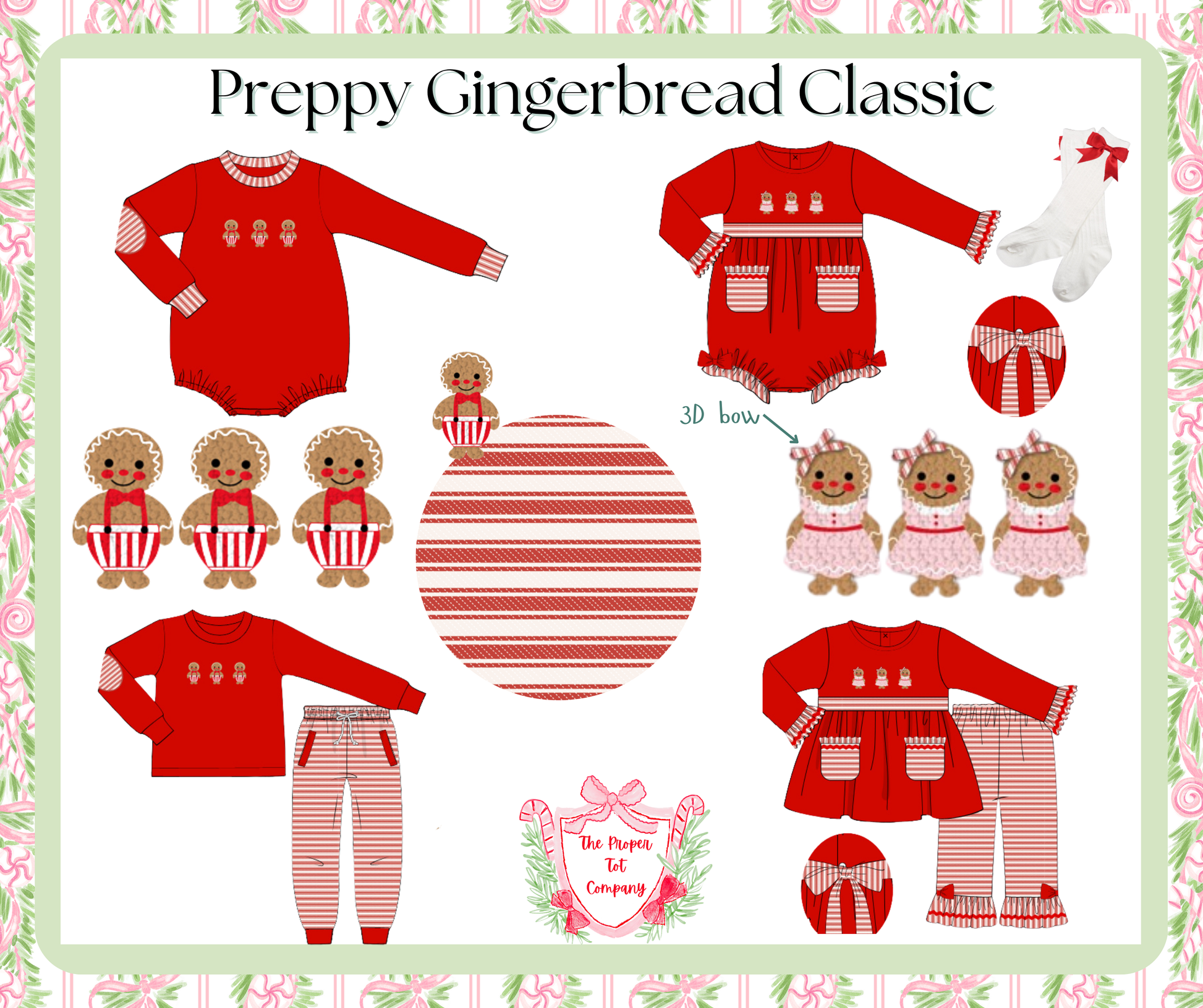 The Preppy Gingerbread Classic Saylor’s Banded Joggers Set features a timeless red ticking stripe accent fabric paired with festive Christmas red knit. Adorned with handsome French knot gingerbread men in red and white striped pants, this piece combines classic holiday motifs with expert craftsmanship for a refined seasonal look.